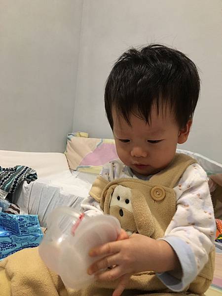 🎀在曬衣服時,兩、三次聽到他有點生氣的哭叫,進來看發現他正在努力把奶嘴盒的蓋子蓋上,因為屢試不成挫敗而叫。不過叫兩聲就又繼續努力,所以我就繼續曬衣服啦。(就是照片上的奶嘴盒啦!)