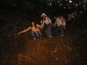 初入山,陡斜的坡確實不易行走,高低的土間雜著樹根,步落之間小心跌滑。越過第一個山頭,下山的路只能緊貼山壁,拉著露出山壁的樹根半滑半攀的下著,面對相機的燦爛笑臉,回頭只能有專心攀著山岩的謹慎戒懼。