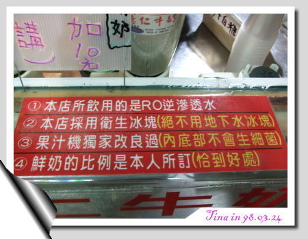 老闆俐落的動作著,我隨口跟老闆聊著,看著它紅底白字貼上的四大特點,忍不住問老闆果汁機怎麼獨家改造的阿?特別在哪呢??