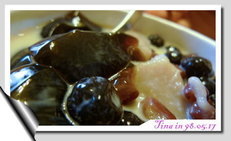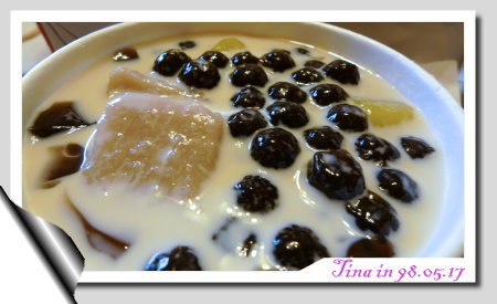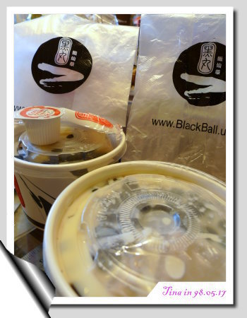 很開心的捧著嫩仙草回家,準備跟爹地、媽咪一起享受,前方的是加了鮮奶的大黑丸一號,後方的豆豆一號則附了鮮奶油一球&一隻湯匙(大黑丸的湯匙呢?!)。