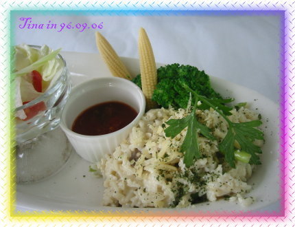 最愛的,是香草奶油的燉飯(好吧,我根本搞不清楚那是啥,只是吃得出香草、奶油、起士,感覺超好吃)。忍不住一口接一口的吃著,還有蘆筍、香菇藏在其中,每次挑到都小小的雀躍哩!