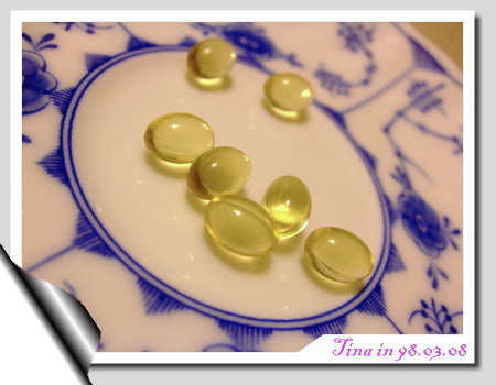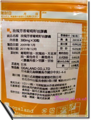 內容物有葡萄籽油、玫瑰油、月見草油(怎麼都是油阿)、維他命A&E、明膠、甘油(後面這兩個是啥啊?),仔細一看還有熱量呢原來不是不會胖的東西阿