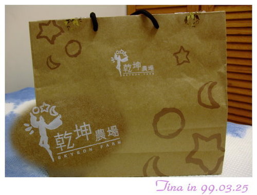 25日晚上,回到家就發現一個很有質感的牛皮紙袋放在餐桌上,簡單的日月星人白色圖騰及乾坤農場字樣打印在上面,突顯了乾坤兩字的意涵