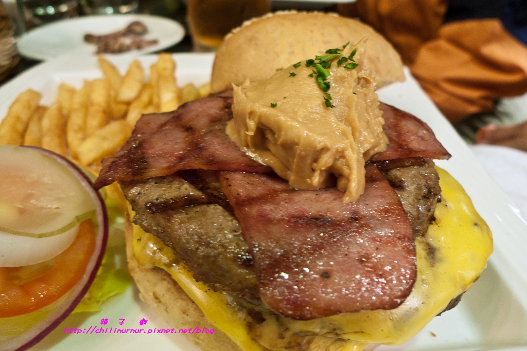 濃郁香滑的花生醬,搭配多汁的雙層牛肉,夾著烤到融化的起司,上面還鋪著培根~